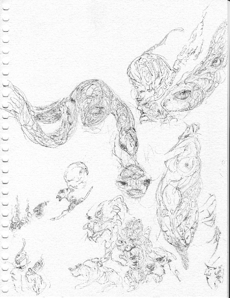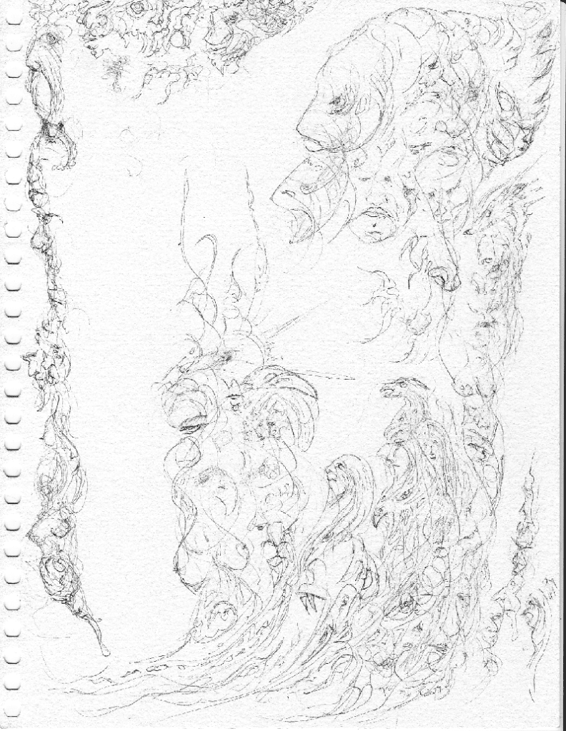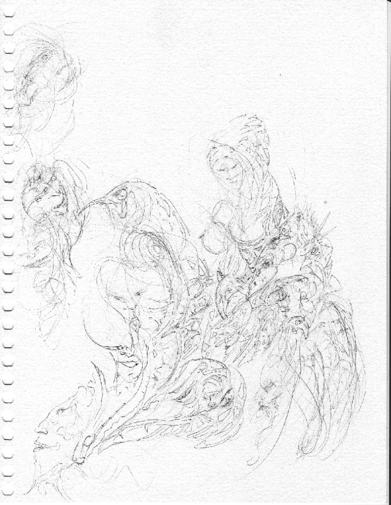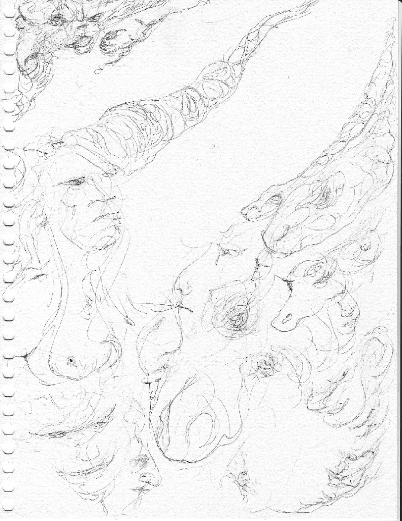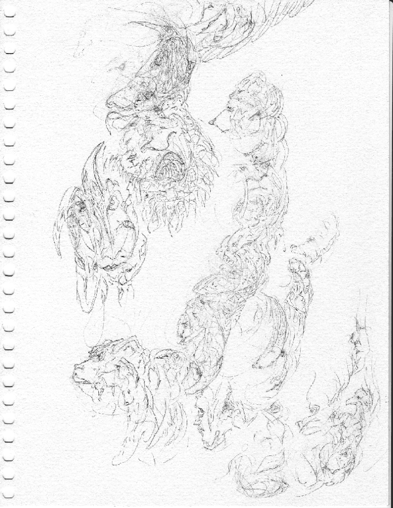 An abstract drawing showing both animal forms mixed with human faces