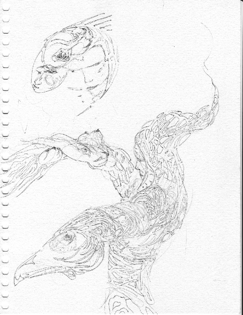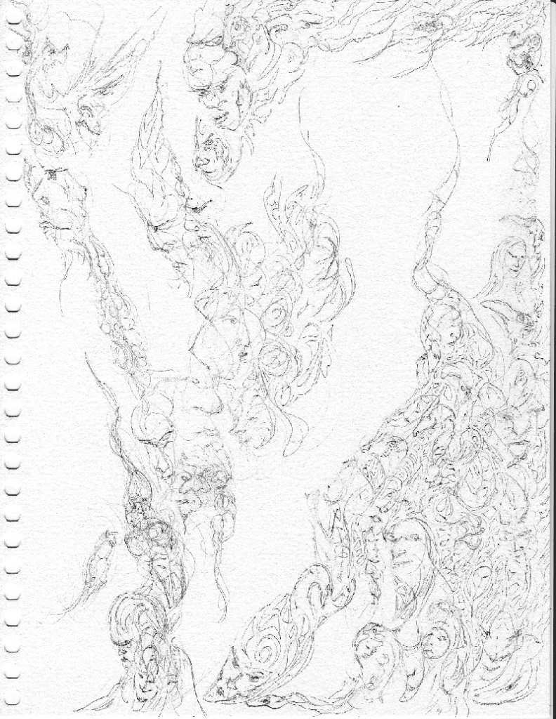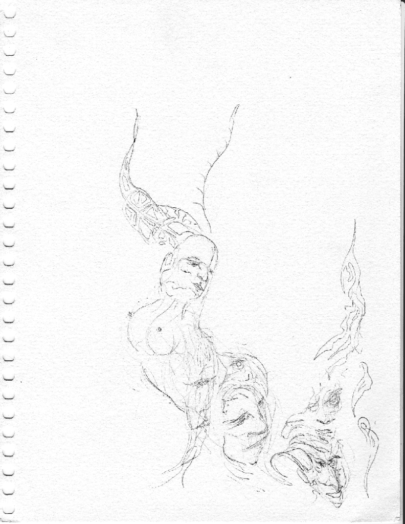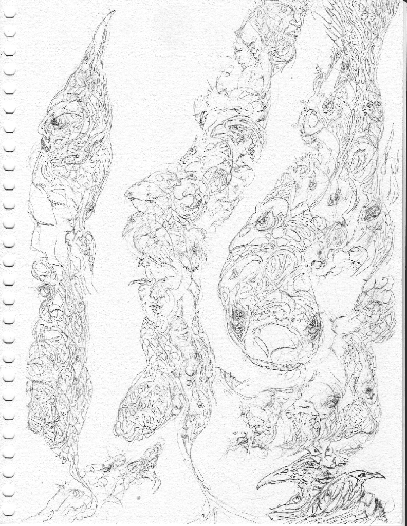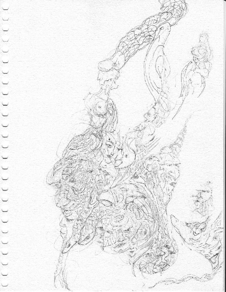 An abstract drawing showing both animal forms mixed with human faces