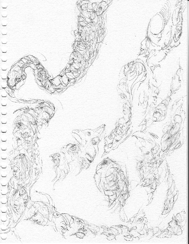 An abstract drawing forming a snake hanging from tree